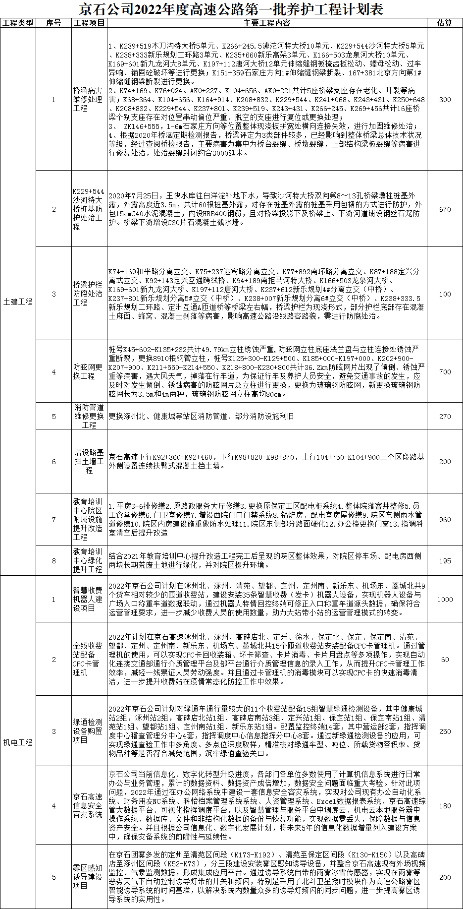 2022年第一批養(yǎng)護(hù)工程計劃
