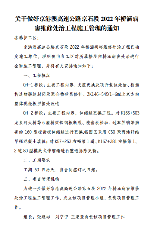 關于做好京港澳高速公路京石段2022年橋涵病害維修處治工程施工管理的通知