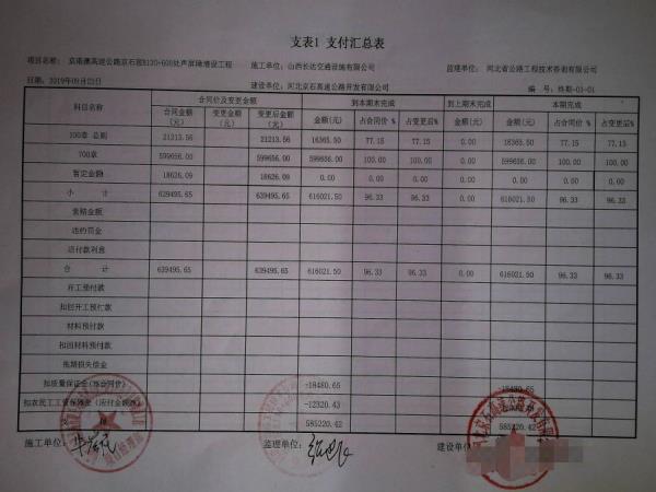 京港澳高速公路京石段K130+600處聲屏障增設工程支付證書