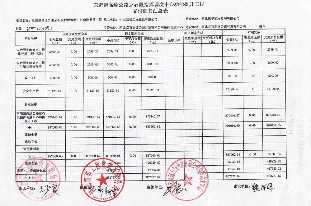 京港澳高速公路京石段指揮調(diào)度中心功能提升工程支付證書(shū)