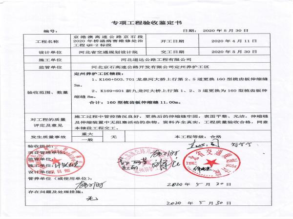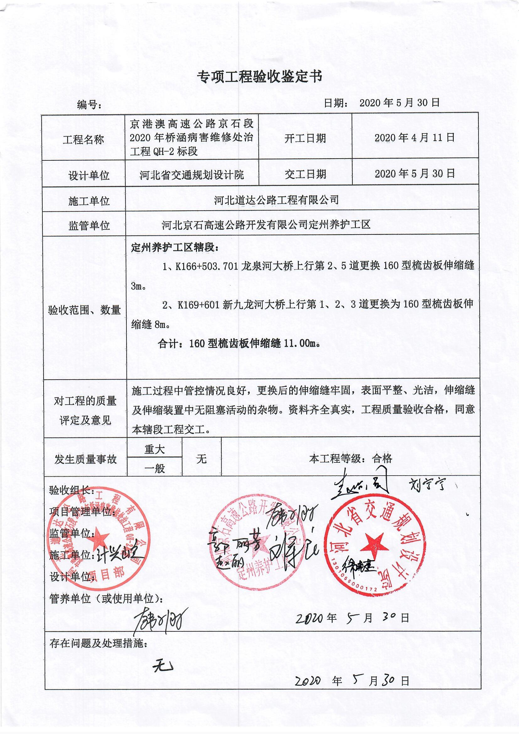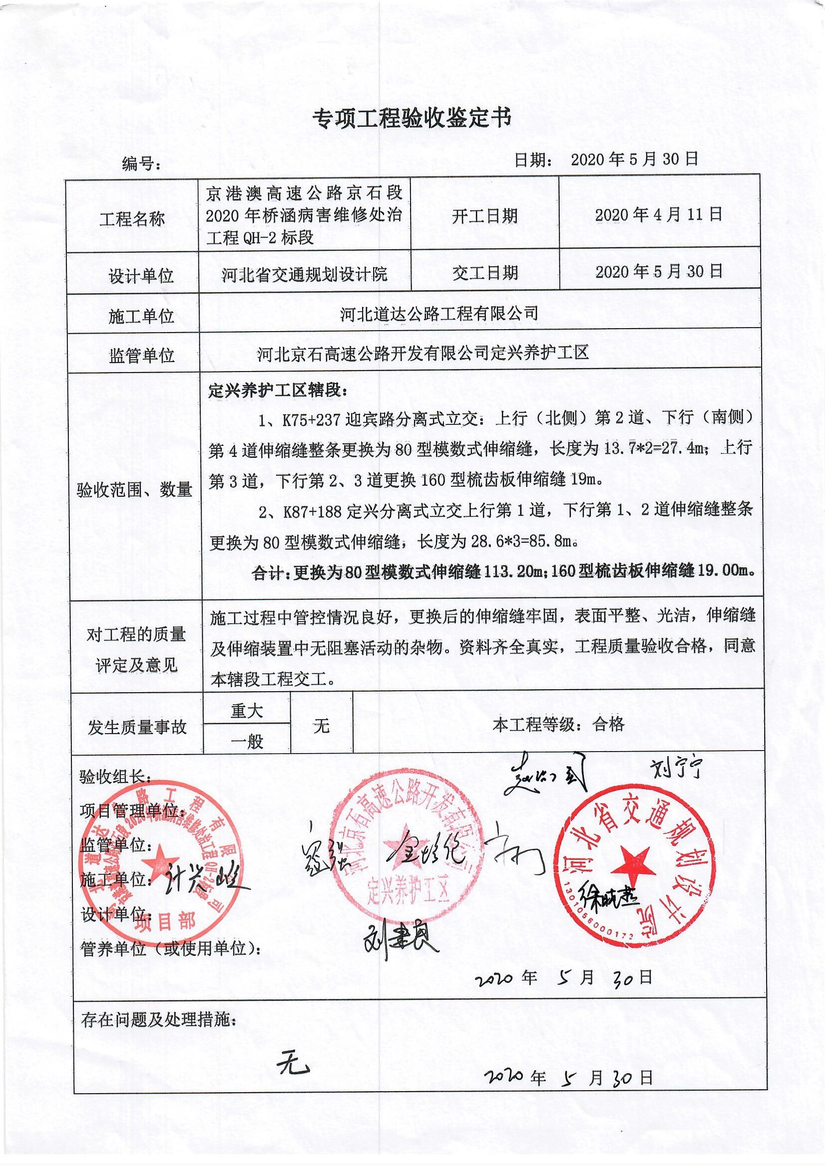 京港澳高速公路京石段2020年橋涵病害處治工程QH-2標段驗收證書