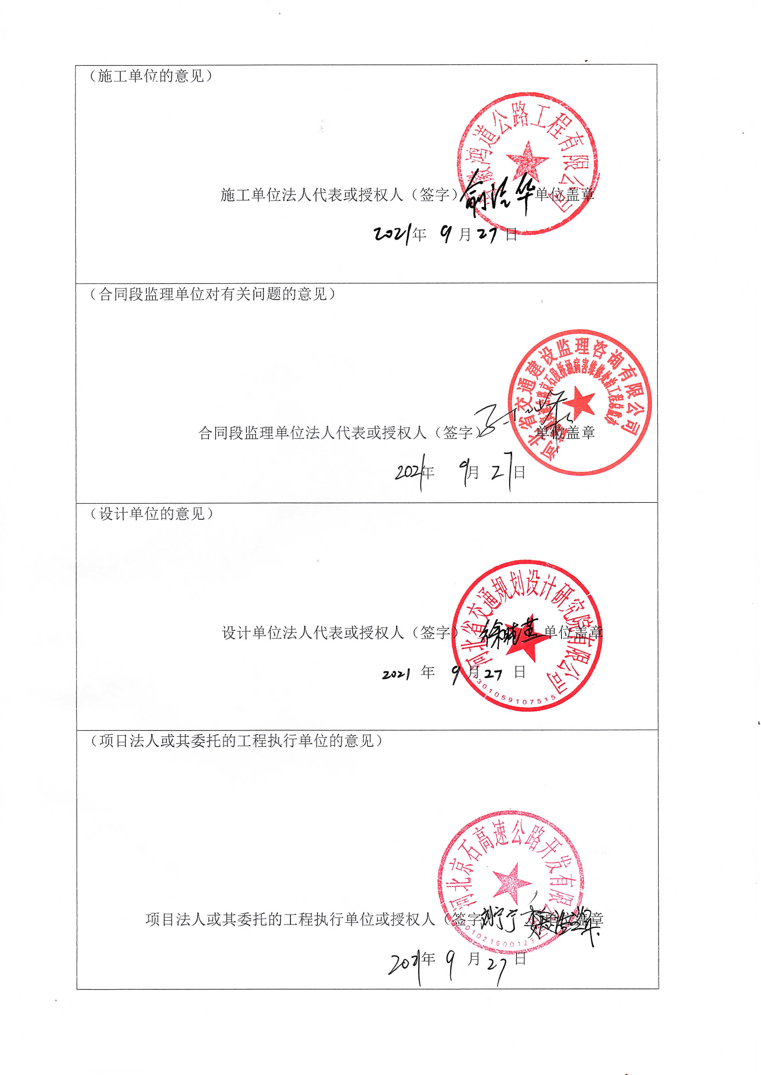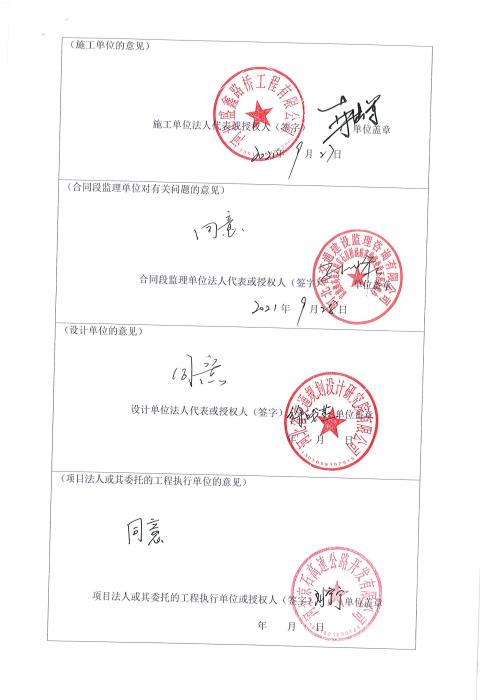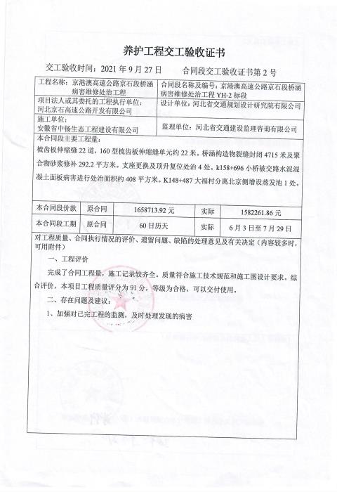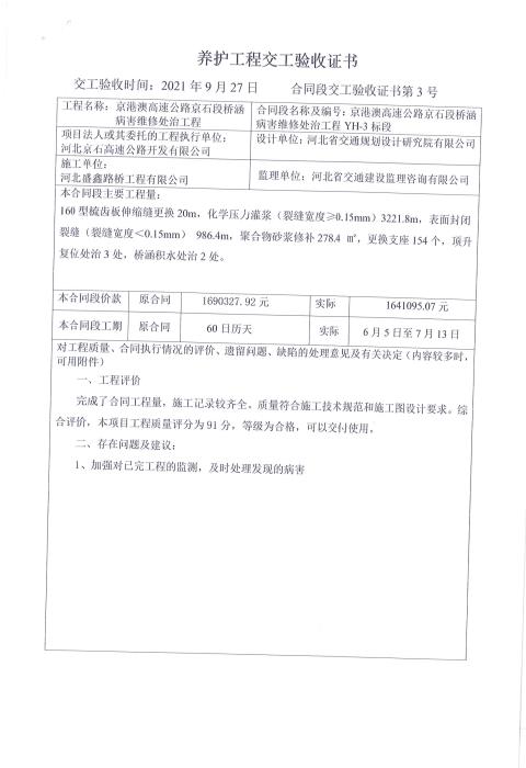 京港澳高速公路京石段橋涵病害維修處治工程驗(yàn)收證書