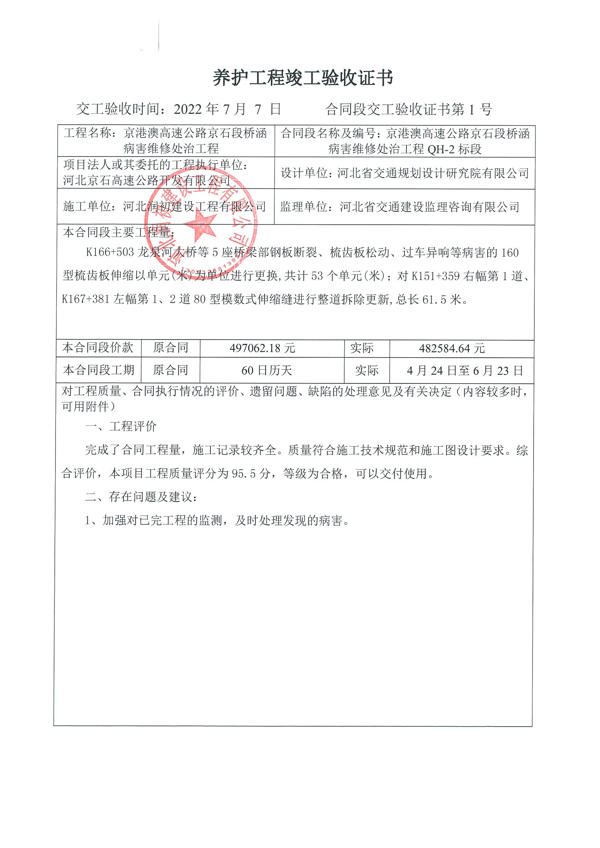 2022年橋涵病害維修處治工程QH-2標(biāo)驗(yàn)收證書