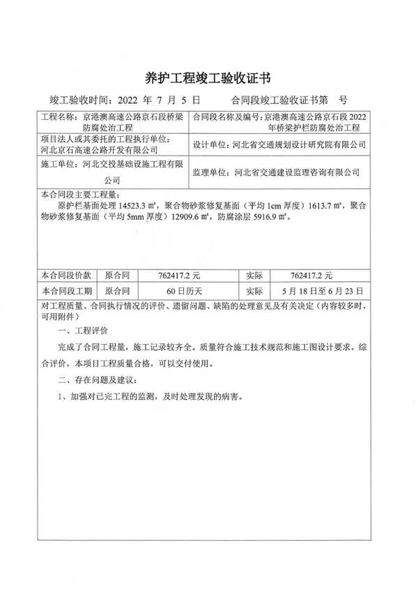 京港澳高速公路京石段2022年橋梁護欄防腐處治工程驗收證書