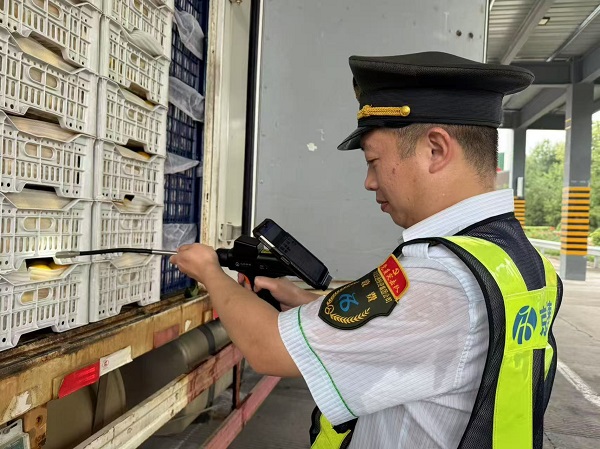 正午時分,收費站廣場地表溫度直逼60℃,瀝青路面泛起微光。黨員們身著反光背心,手持查驗終端,穿梭于一輛輛綠通貨車之間。掀開篷布時,撲面而來的熱浪裹挾著果蔬氣息,他們卻無暇擦拭額頭豆大的汗珠,仔細核對貨物品類、查驗裝載空間、拍攝留存影像?!跋募竟瞎赘瘔模轵炈俣染褪切?,更是民生溫度?!?/p>