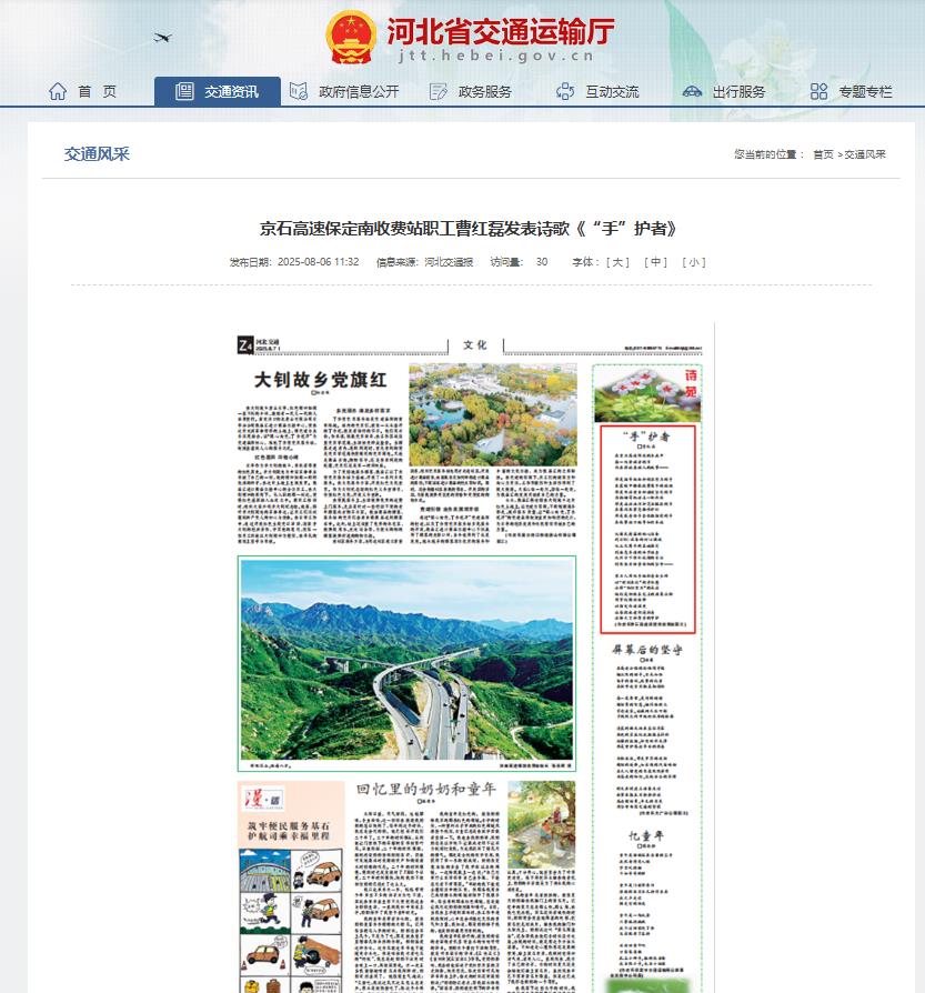 【河北省交通運(yùn)輸廳】京石高速保定南收費(fèi)站職工曹紅磊發(fā)表詩歌《“手”護(hù)者》