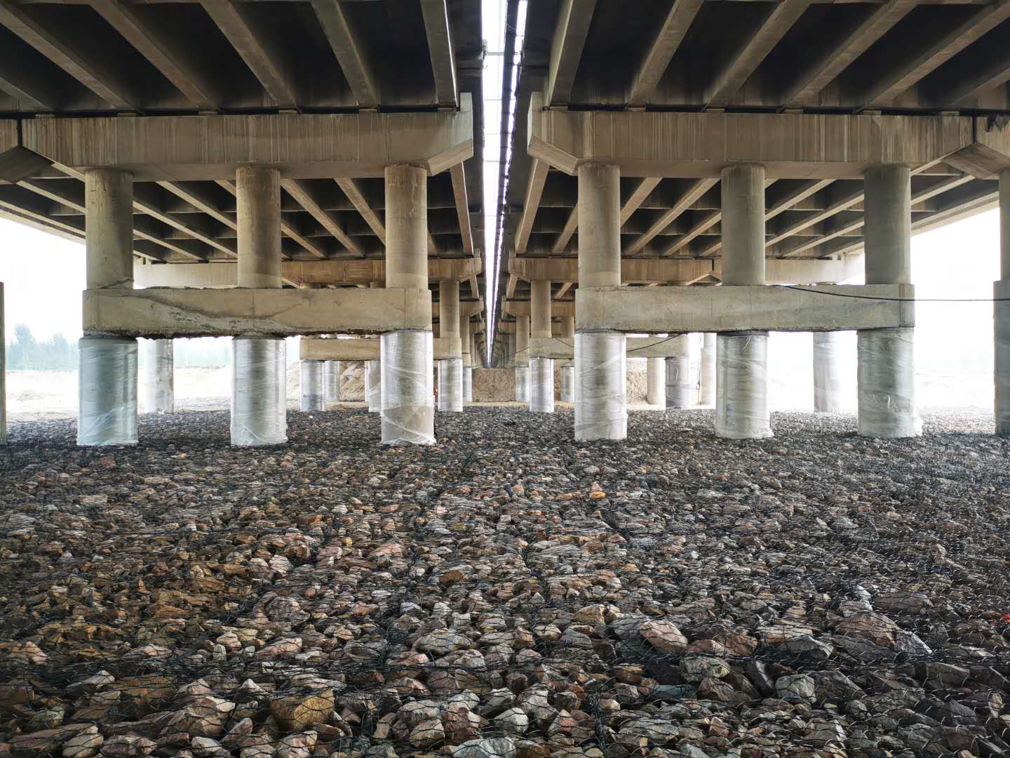 如今,沙河特大橋已沒有20多天來晝夜奔忙的施工大軍和熱火朝天的勞動景象,代之的是讓京石公司和建設(shè)者們十分欣慰的成果:40根做過外包防護(hù)的樁基整齊排列,腳底下是40m范圍的鋼絲石籠,構(gòu)成了一道靚麗的風(fēng)景線。