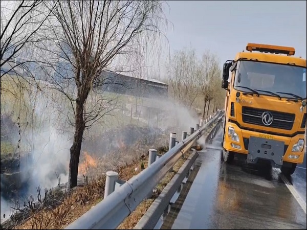 火情就是命令,巡查人員迅速做出反應,采取應急措施,即刻兵分兩路。其中一組迅速將巡查車后移,在上游位置打開警報器、警示燈,警示車輛減速謹慎通過;另一組迅速取用隨車滅火工具展開撲救。因火勢過猛,人工滅火難以控制,工區(qū)緊急抽調(diào)附近正在進行綠化澆水作業(yè)的水車前來支援。經(jīng)過近30分鐘全力撲救,火情被撲滅,保障了過往車輛安全通行。