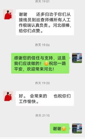 半小時后車主抵達三工區(qū),他激動地向巡查人員連聲致謝,并感慨道:“我本來沒報希望能找回來,你們的高速值班員和巡查員工作都很認真負責,讓我收到意外的驚喜,河北很棒,給你們點贊!”值班員則暖心回復:“感謝您的信任與支持,這是我們應(yīng)該做的!祝您一路平安,歡迎常來河北!”