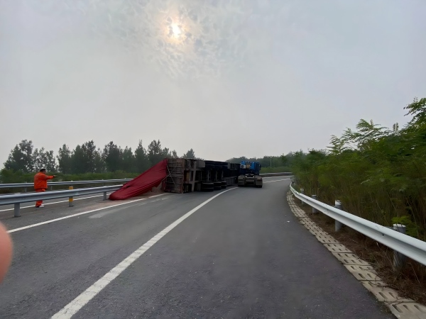 險(xiǎn)情突發(fā)之際,機(jī)電二科值班人員迅速啟動(dòng)應(yīng)急處置流程。一方面立即指揮后方來(lái)車(chē)靠邊???,另一方面對(duì)貨車(chē)司機(jī)展開(kāi)情況核查。在確認(rèn)司機(jī)身體無(wú)大礙后,二人即刻啟動(dòng)多方聯(lián)動(dòng)機(jī)制——同步聯(lián)系智慧調(diào)度監(jiān)控中心、高速交警、養(yǎng)護(hù)工區(qū)及路政大隊(duì),精準(zhǔn)上報(bào)事故具體位置、現(xiàn)場(chǎng)擁堵程度及貨物散落范圍等關(guān)鍵信息;與此同時(shí),及時(shí)通知機(jī)場(chǎng)東收費(fèi)站安排人員趕赴現(xiàn)場(chǎng),疏導(dǎo)后方積壓車(chē)輛。為防范二次事故,二人還在事故現(xiàn)場(chǎng)后方快速布設(shè)反光錐桶,劃定安全警示區(qū)域,全程堅(jiān)守現(xiàn)場(chǎng)維護(hù)交通秩序。