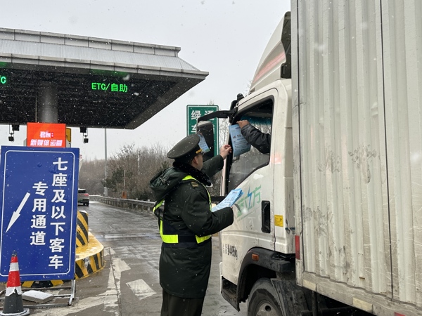 收費(fèi)員利用車(chē)輛通行間隙,主動(dòng)提醒過(guò)往車(chē)輛注意雪天路滑、減速慢行。同時(shí),向司乘人員發(fā)放雪天行車(chē)安全宣傳單,并提供印有冬季行車(chē)注意事項(xiàng)的實(shí)用濕巾,幫助駕駛員提升安全意識(shí)。