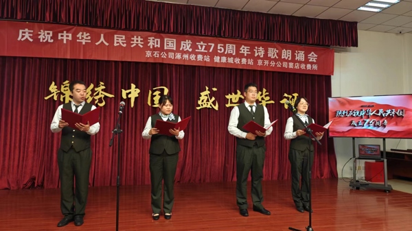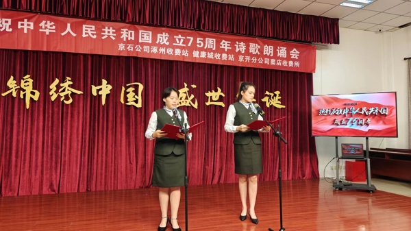 錦繡中國(guó),盛世華誕,七十五載,征程如虹。為隆重慶祝中華人民共和國(guó)成立七十五周年,延續(xù)京冀兩地高速收費(fèi)站共建深情,共同抒發(fā)熱烈的愛國(guó)情懷,9月30日上午,健康城收費(fèi)站、涿州收費(fèi)站黨支部聯(lián)合兩站分會(huì)與京開分公司竇店收費(fèi)所,在健康城站共同開展了慶祝中華人民共和國(guó)成立75周年詩(shī)歌朗誦會(huì)活動(dòng)。奮斗在祖國(guó)交通事業(yè)一線的工作者們,滿懷豪情,把對(duì)祖國(guó)的無(wú)盡熱愛熔鑄于一首首激情澎湃的詩(shī)篇之中,以詩(shī)的激昂韻律,歌頌祖國(guó)的壯麗騰飛。