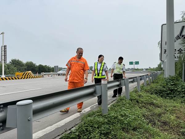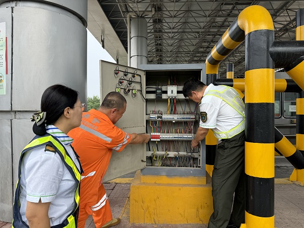 強(qiáng)降雨來臨,定興站迅速行動(dòng),全力應(yīng)對(duì)。一方面,時(shí)刻關(guān)注排水通道排水情況,排水口臨近區(qū)域放置清淤工具,對(duì)雜物和淤泥進(jìn)行拉網(wǎng)式清理,確保排水順暢。同時(shí)檢查排水泵供電線路和運(yùn)行狀態(tài),提前啟動(dòng)備用排水泵,增強(qiáng)低洼區(qū)域排水能力,形成“前端清淤—中端導(dǎo)流—末端強(qiáng)排”的全流程排水體系。另一方面,對(duì)地勢較低的區(qū)域,堆放防汛沙袋,筑起堅(jiān)固“防線”,有效阻擋了雨水的侵入。安排專人在收費(fèi)車道關(guān)注車道內(nèi)情況,通過手持?jǐn)U音器,提醒司乘人員“減速慢行、保持車距、謹(jǐn)慎通過積水路段”,注意行車安全,在愛心驛站配備雨衣、手電等應(yīng)急幫助物品,以備惡劣天氣下協(xié)助駕駛員安全撤離。