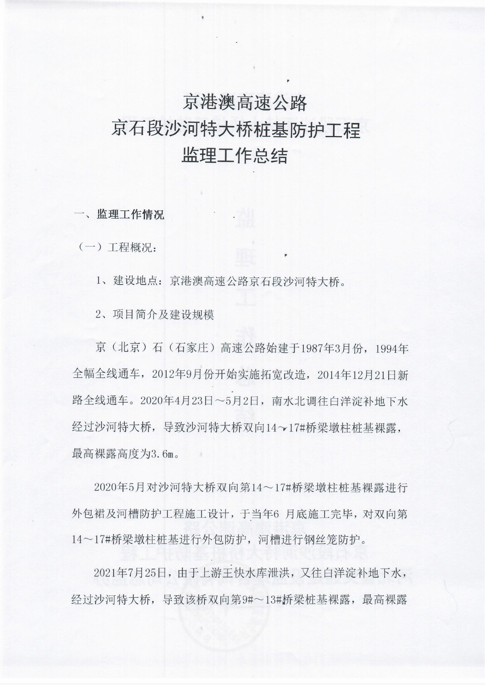京港澳高速公路京石段沙河特大橋樁基防護(hù)處治工程監(jiān)理報(bào)告