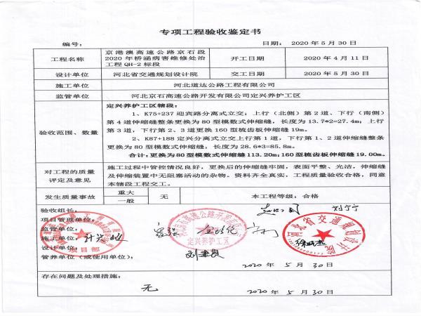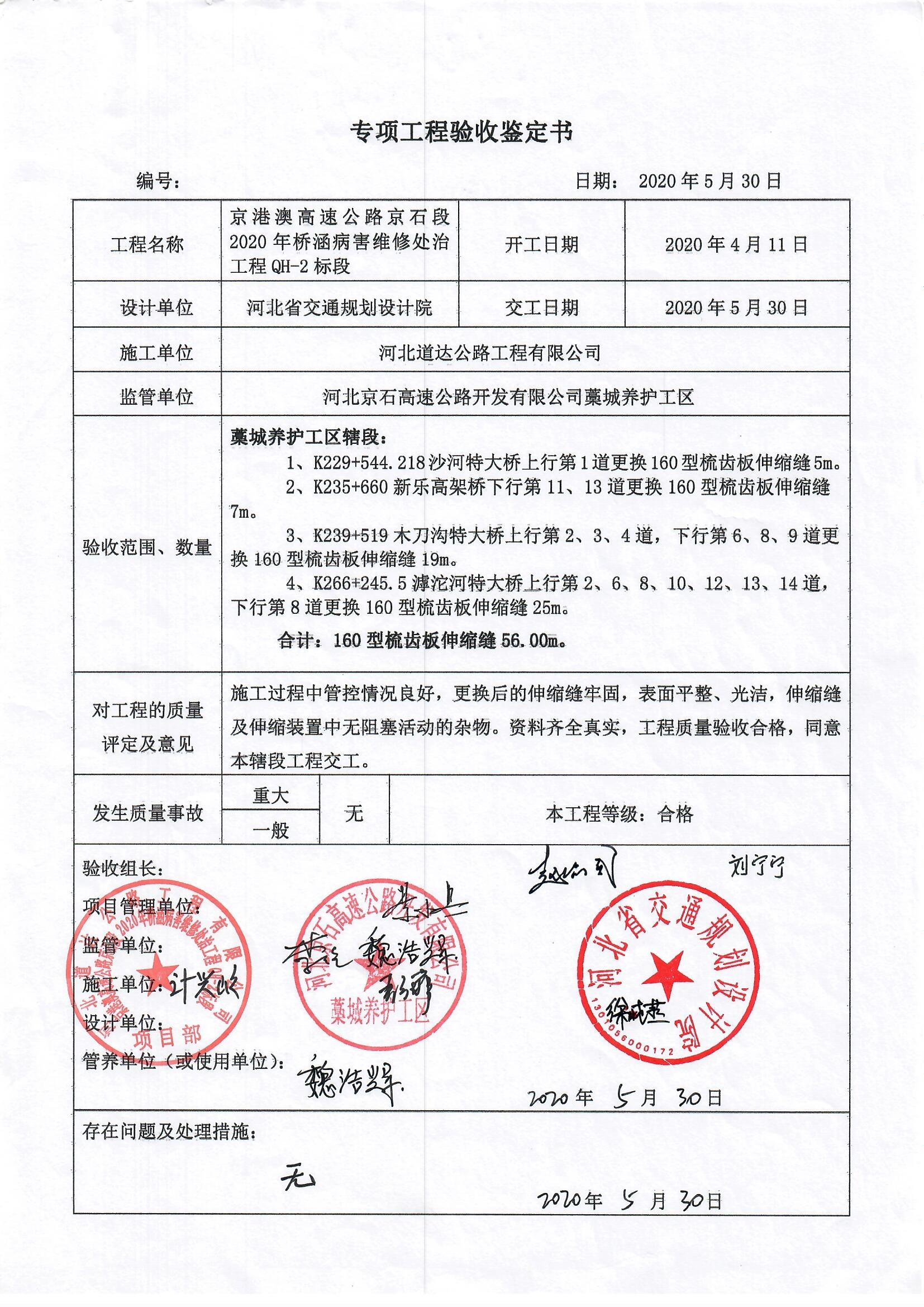 京港澳高速公路京石段2020年橋涵病害處治工程QH-2標段驗收證書
