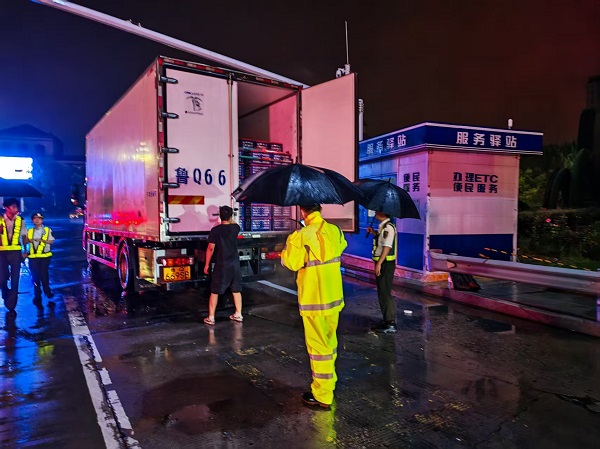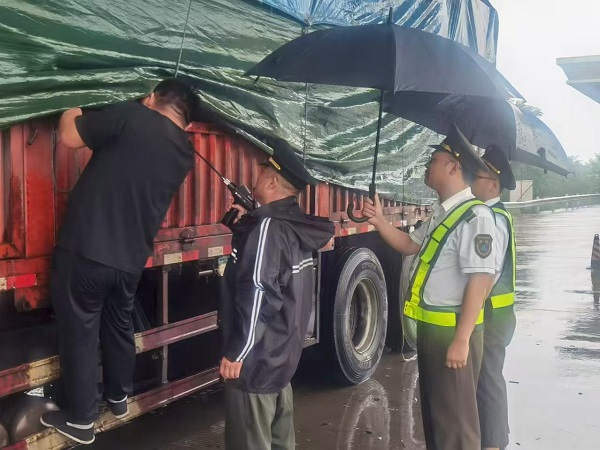 “綠通車(chē)輛車(chē)身重,雨天路滑易打滑,大家引導(dǎo)時(shí)務(wù)必站在安全區(qū)域,仔細(xì)核對(duì)證件和貨物信息!”突擊隊(duì)隊(duì)長(zhǎng)的喊話雖被雨聲切割成碎片,卻清晰地傳到每個(gè)隊(duì)員耳中。而此時(shí)正值綠通車(chē)輛通行高峰,新鮮蔬菜、水果等物資運(yùn)輸車(chē)源源不斷駛來(lái)。若因暴雨導(dǎo)致查驗(yàn)效率下降,不僅會(huì)造成車(chē)道擁堵,更可能讓鮮活物資因延誤受損。突擊隊(duì)隊(duì)長(zhǎng)一聲令下,幾名黨員迅速集結(jié),攜帶查驗(yàn)工具、防滑墊、警示錐等物資,沖向雨勢(shì)最猛的收費(fèi)廣場(chǎng)。