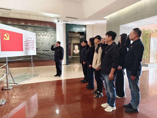 在李大釗紀(jì)念館前,全體黨員整齊列隊,面向黨旗莊嚴(yán)宣誓,重溫入黨誓詞。鏗鏘誓言回蕩在廣場上空,彰顯了同志們堅守初心、勇?lián)姑膱远ㄐ拍睢?/p>