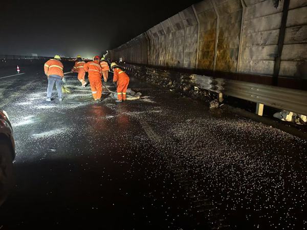 現(xiàn)場作業(yè)人員爭分奪秒地對事故現(xiàn)場進行清理和救援。清障救援隊利用專業(yè)設(shè)備,將受損車輛快速拖離現(xiàn)場,工區(qū)作業(yè)人員利用大型機械清理路面上的散落物,同時為防止路面結(jié)冰,在清理后的事故路段撒布了融雪劑。經(jīng)過近三個小時緊張有序的奮戰(zhàn),事故現(xiàn)場的散落物終于被清理干凈,路面恢復(fù)了正常通行。