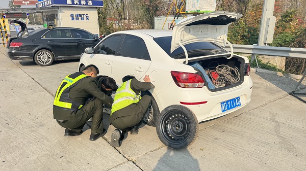 11月4日,京石高速定興收費(fèi)站口,一輛白色轎車駛出收費(fèi)車道時(shí),左后輪胎已然癟氣。值班工作人員第一時(shí)間示意司機(jī)??堪踩恢?,并迅速展開檢查。