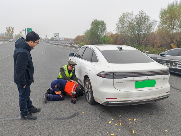 11月6日上午8時(shí)許,一輛白色新能源轎車因左后輪突發(fā)爆胎被迫停靠在涿州站入口內(nèi)廣場(chǎng)處并亮起了雙閃警示燈。這一異常情況被現(xiàn)場(chǎng)工作人員第一時(shí)間發(fā)現(xiàn),并立即上前查看情況。