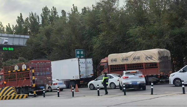 下午3時(shí)30分左右,第一波繞行車流抵達(dá)站口。望都站廣場瞬間排起長隊(duì),卻秩序井然——疏導(dǎo)人員在車道間來回穿梭,精準(zhǔn)引導(dǎo)小型客車、大型貨車分道通行;收費(fèi)員協(xié)助司機(jī)取卡、收費(fèi)等;綠通查驗(yàn)崗的人員認(rèn)真拍照留檔,額角的汗珠閃著光:“綠通車輛必須嚴(yán)查細(xì)驗(yàn),既保暢通,更不能漏放違規(guī)車!”
