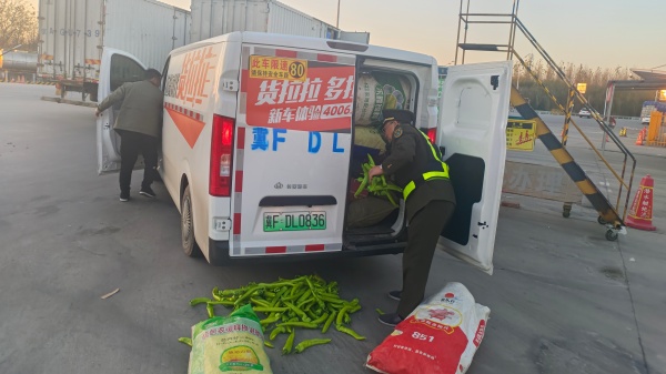 12月3日16時左右,一輛裝載蔬菜的綠通貨車在保定南站下路,在檢驗過程中,當查驗拍照時,車廂后門打開的剎那,上面裝的尖椒灑落滿地。司機一下慌了神,露出了焦急的神情?!柏浿髡戎l(fā)貨。這可怎么辦啊,肯定會扣我的運費〞正在驗貨的馬立杰趕緊安慰說:“師傅別急啊,我們馬上幫您裝上車?!?/span>