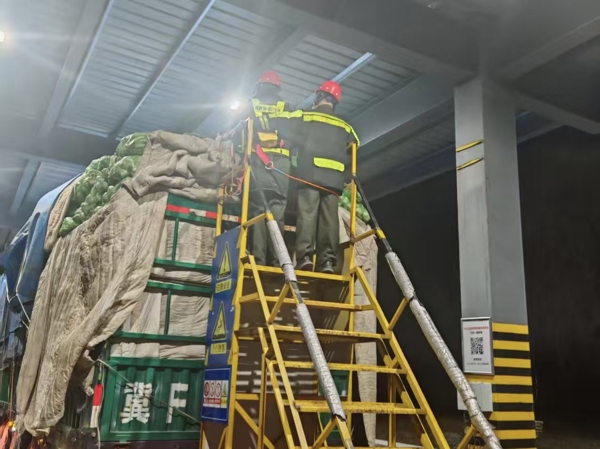 他們身披反光背心、頭戴安全帽,佇立在冰冷的登高梯上,對(duì)每一輛綠通車輛開(kāi)展細(xì)致查驗(yàn)。金屬梯階寒氣刺骨,手套早已凍得僵硬,他們卻依然一絲不茍地核對(duì)貨物品類、核查裝載比例,確保運(yùn)輸鮮活農(nóng)產(chǎn)品都符合綠通政策要求。