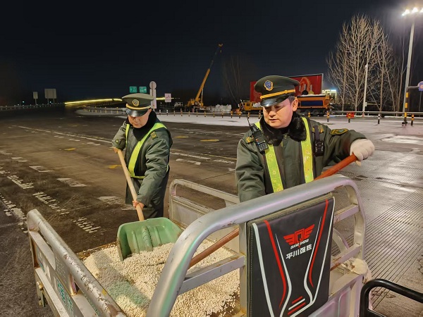 為了防止夜間低溫導(dǎo)致路面結(jié)冰,值班人員全員出動,拿起鐵鍬和融雪劑,在每一條車道上細(xì)致撒布。冰冷的融雪劑在他們手中傳遞,而他們心中想的,只有讓每一輛過往的車輛都能平安駛過。